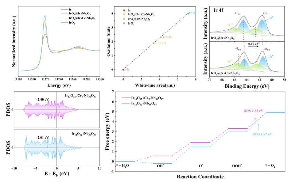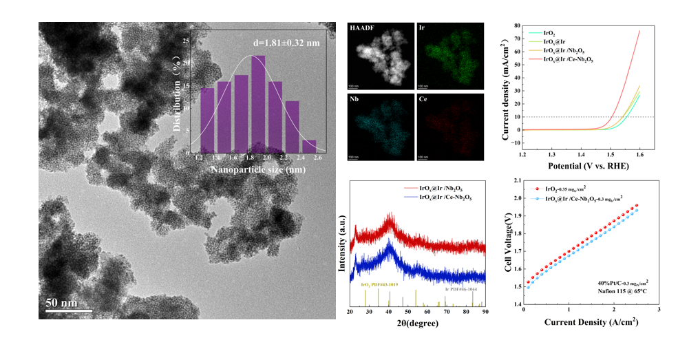 中科院上海高等研究院杨辉研究员团队与宁波中科科创研发团队通过在Nb2O5载体材料均匀引入微量Ce原子,并表面负载超小IrOx颗粒 (<2 nm),构建一种具备强“金属氧化物-载体”相互作用的负载型Ir基催化剂(IrOx@Ir/Ce-Nb2O5)。于载体材料中进行Ce原子掺杂,既提升载体与活性中心间的电子转移能力,同时保证Ir/IrOx活性材料的晶格完整性,避免催化活性快速衰减。该催化剂酸性析氧反应过电位仅275 mV@10 mA cm-2,并在膜电极实际工况下表现出良好的活性与稳定性,正持续检测低载量下的长周期寿命(0.3 mgIr cm-2)。