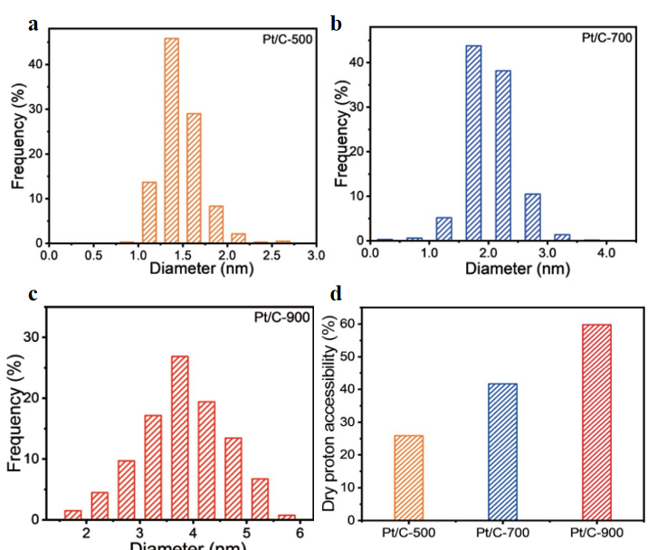 图2. Pt/C-500、Pt/C-700、Pt/C-900的Pt颗粒尺寸与干质子可及率。(Sci. China Mater. 2024, 67, 1851-1857)