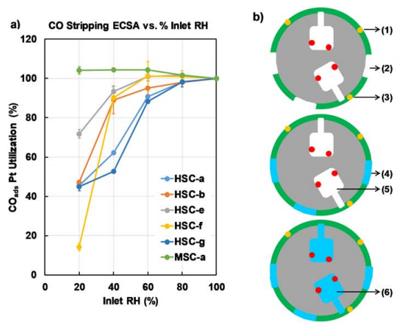 图1. a) 催化剂在不同湿度下测得的Pt利用率。b) 不同湿度条件下的催化剂示意图。从上至下,湿度升高。其中,黄色代表孔道外的Pt位点,红色代表孔道内的Pt位点,绿色代表离聚物,蓝色代表液态H2O。(J. Electrochem. Soc. 2020, 167 (6), 064515)